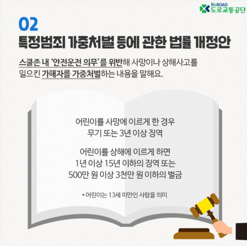 여기, 이 가중처벌 법률 개정안의 주 내용은, 운전자가 안전의 의무를 다하지 않았을 경우에 실형에 처한다. 라는 것이며, 이를 운전자가 특히 어린이 안전 보호 구역에서 운전하여야할 의무를 위반하였을 때는 '교통 사고 처리 특례 법 제3조 제1항'에 따라 가중처벌한다라는 내용입니다.
