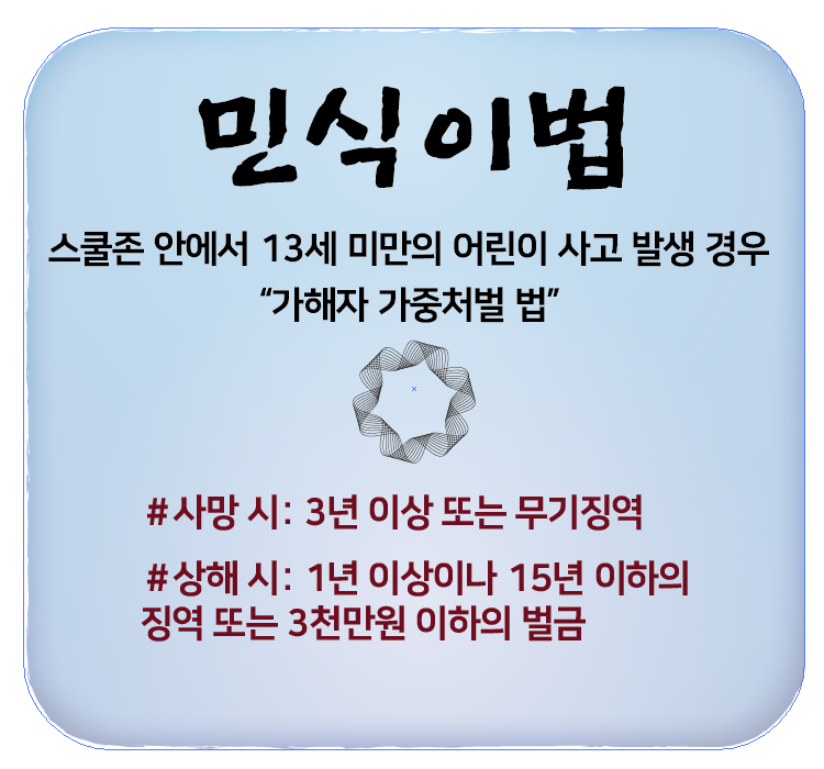 민식이법은 왜 생겼을까? 김민식군을 치었던 운전자의 차량은 30km 이하로 서행하고 있었다고 합니다. 하지만 민식군은 서행했음에도 불구하고 부딪힌 충격으로 인해 그자리에서 즉사를 하였다고 합니다. 이러한 안타까운사연은 주변과 인터넷에 빠르게 퍼지며 언론사에서도 주목을 하기까지 이르었습니다.
