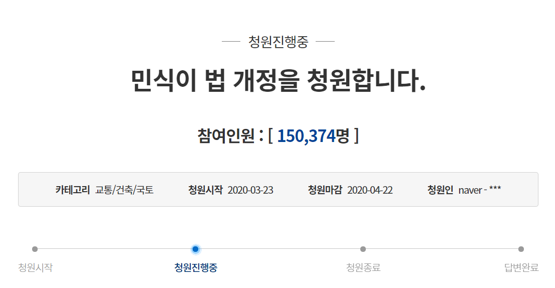 2020년 3월 27현재 약 15만명 이상의 사람들이 민식이 법 개정을 원한다고 청원을 하고 있습니다. 청원은 3월 23일에 시작되었고 4월22일 청원마감이 될 예정입니다.