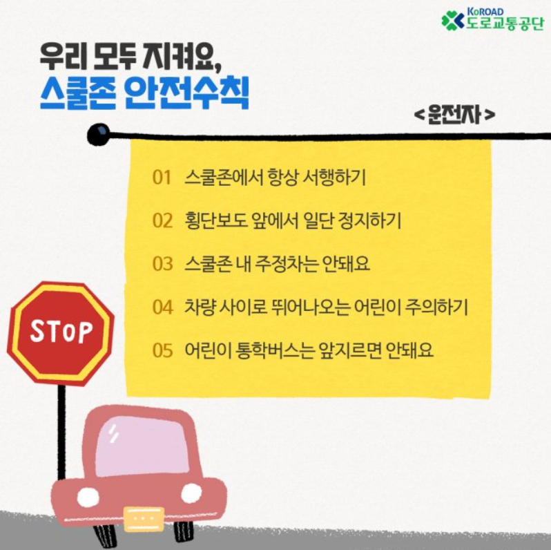 운전자는 스쿨존에서 항상 서행하고, 횡단보도에서는 무조건 정지, 스쿨존내 주정차 금지, 어린이 주의, 통학버스 앞지르기 금지 등의 안전 수칙을 지켜야만 합니다.