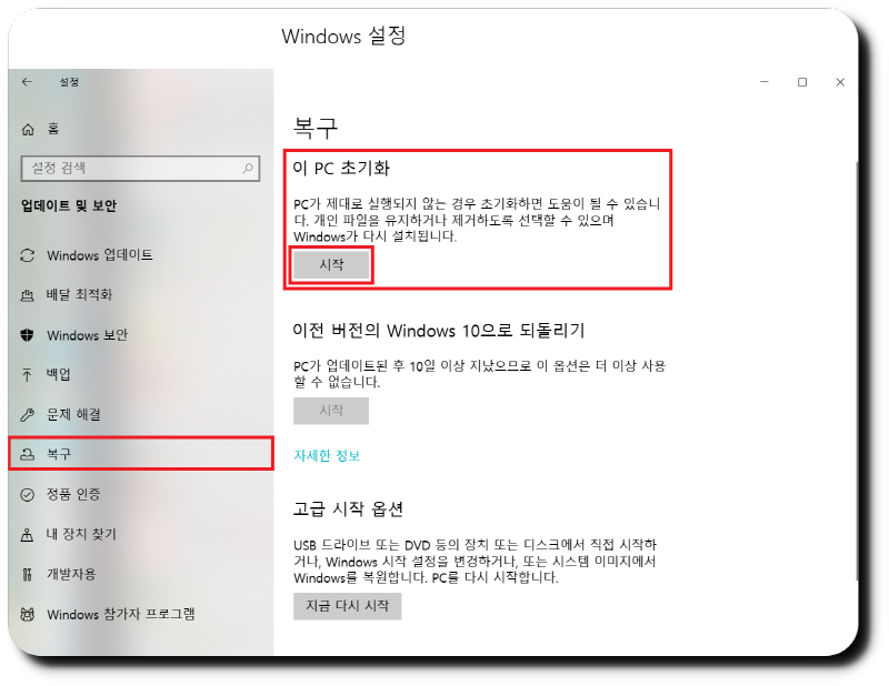 포멧 입니다. Windows 설정에서 업데이트 및 보안을 누르신 후에,