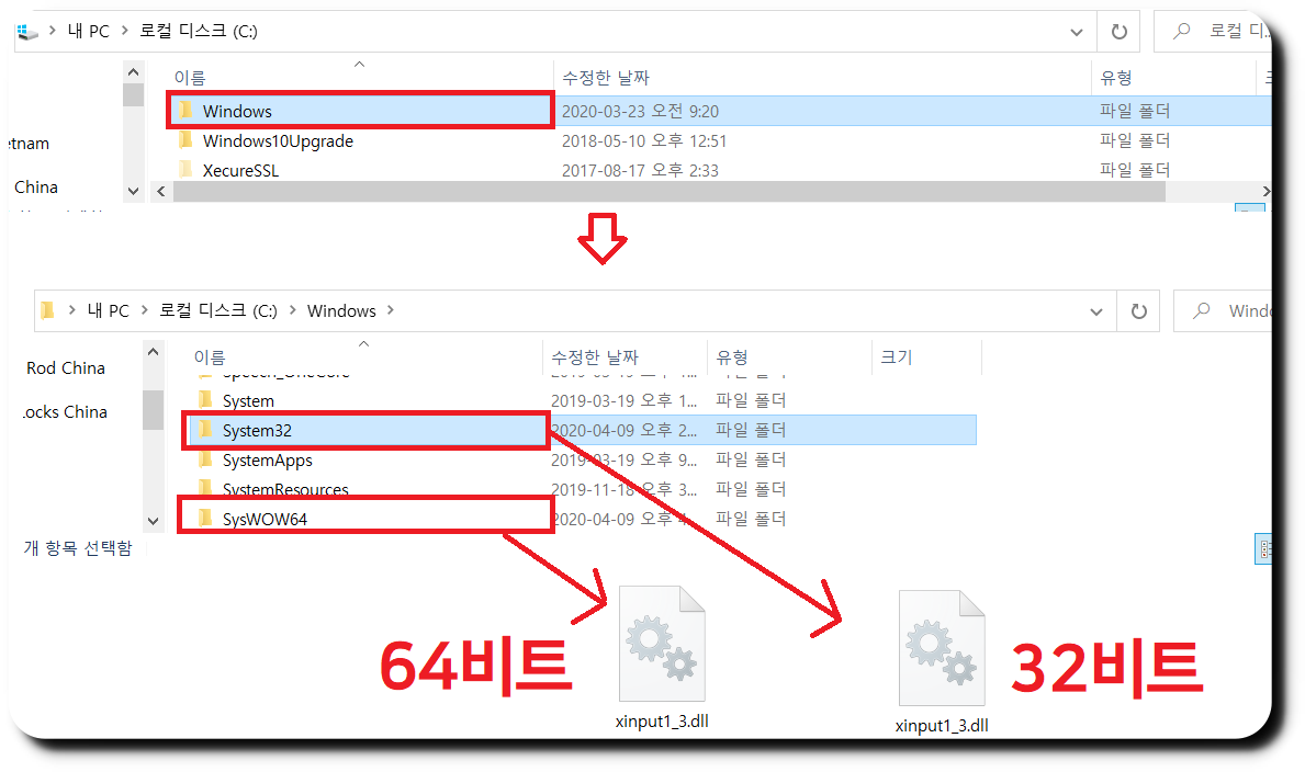 아래 이미지를 참고해주세요! 내PC 에서 Windows 폴더를 찾고 System 32는 32비트 파일, sysWOW64 에는 64비트 파일을 넣어주시면됩니다.
