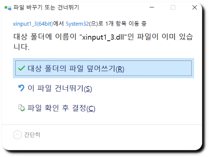 그 다음 혹시라도 이런 문구가 뜨게 되면 '대상 폴더의 파일 덮어쓰기'를 눌러서 기존파일을 덮어 씌워 주면 됩니다.