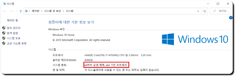 그러면 시스템 종류나 프로세서 등을 볼 수 있는 창이 하나 뜨는데요. 여기서 64비트 운영체제 인지 32비트 운영체재인지 확인해주시면 됩니다.