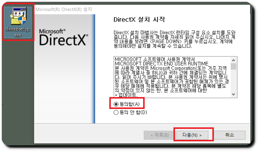 아래 이미지와 같이 dxwebsetup.exe 라는 파일이 다운로드 되었습니다. 이제 동의하시고 설치해주시면 끝입니다.