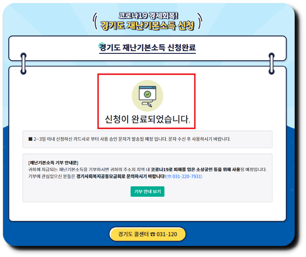 재난기본소득 안내문 이라는 메시지도 아래에 떴는데 조금 더 크게 써줬으면 좋았을 것 같습니다. 제가 신청해서 지급을 받는 재난 기본소득을 기부를 할 수가 있다고 하는데, 이 금액은 코로나19로 인하여 피해를 입은 지역 소상공인등을 위해 좋은 곳에 쓰일예정이라고합니다.