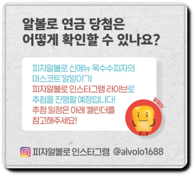 피자알볼로 인스타그램 @ALVOLO1688 을 팔로우 하게 되면 당첨이 됫는지 안됫는지 3일마다 확인을 할 수가 있습니다! 피자사먹고 당첨됬는지 확인해야 겠네요. 팔로우 일단 해보자구요.