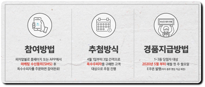 프로모션 하는 이유 : 2020/04/01 옥수수피자 신제품 출시로 이벤트를 한다고 합니다.