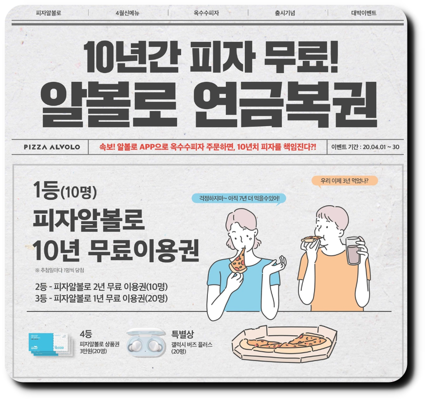 그러나 이쁘게 만들어서 눈길을 끄는 것이 아니고, 이벤트에 당첨이 되면 피자를 10년동안 공짜로 계속 이용할 수 있다는 것입니다. (피자알볼로가 파산하면 못먹겠지만 말입니다⭐)