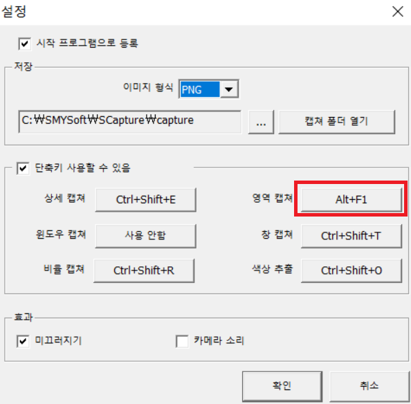 기본설정은 영역 캡쳐기능으로 설정이 되있는데, 저는 사실 영역 캡쳐 기능 말고는 쓰지 않습니다.