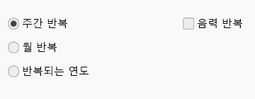 ▼ 메모상자에서 네 번 째 버튼을 클릭하면 중복 이벤트 추가/편집 창이 뜨게 되는데, 매주 혹은 매월 혹은 매년 아니면 음력 날짜 반복기능이 있습니다. 심지어 색상도 변경이 가능합니다.