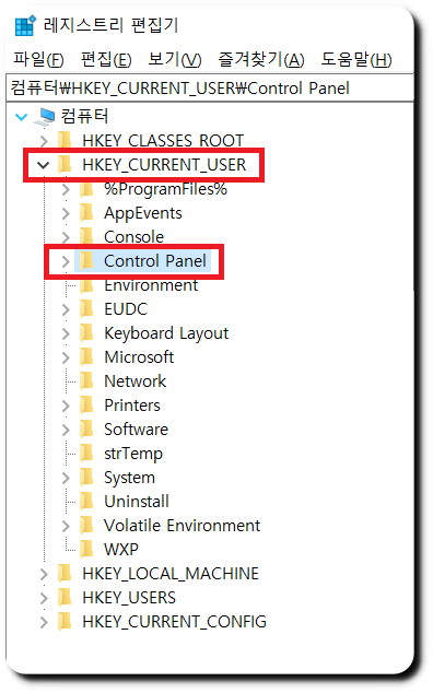 ▼HKEY_CURRENT_USER를 눌러 하위 레지스트리를 열어 준뒤 Control Panel 을 다시 눌러 하위 레지스트리를 펼쳐줍니다.