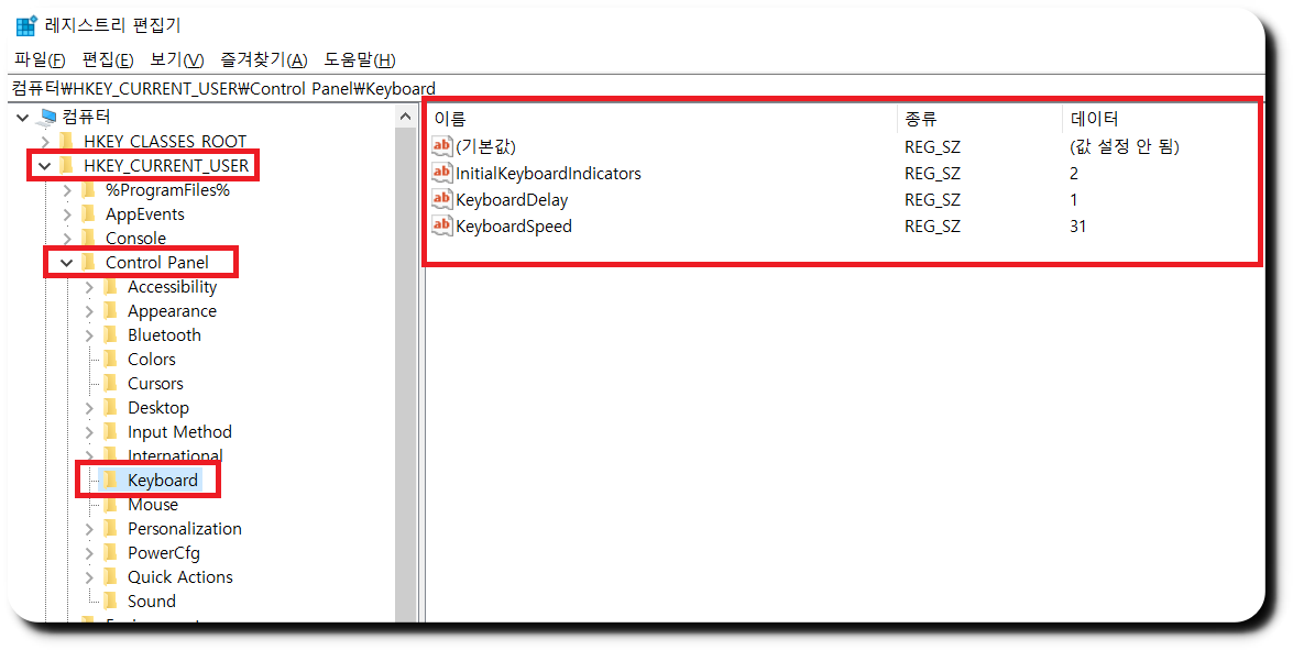 ▼HKEY_CURRENT_USER를 눌러 하위 레지스트리를 열어 준뒤 Control Panel 을 다시 눌러 하위 레지스트리를 펼쳐치면 Keyboard 가 보입니다. Keyboard 를 누르게 되면 오른쪽에 내용에 몇가지가 뜨는데 저 숫자를 이제 바꿔주면 되는 것인데요.