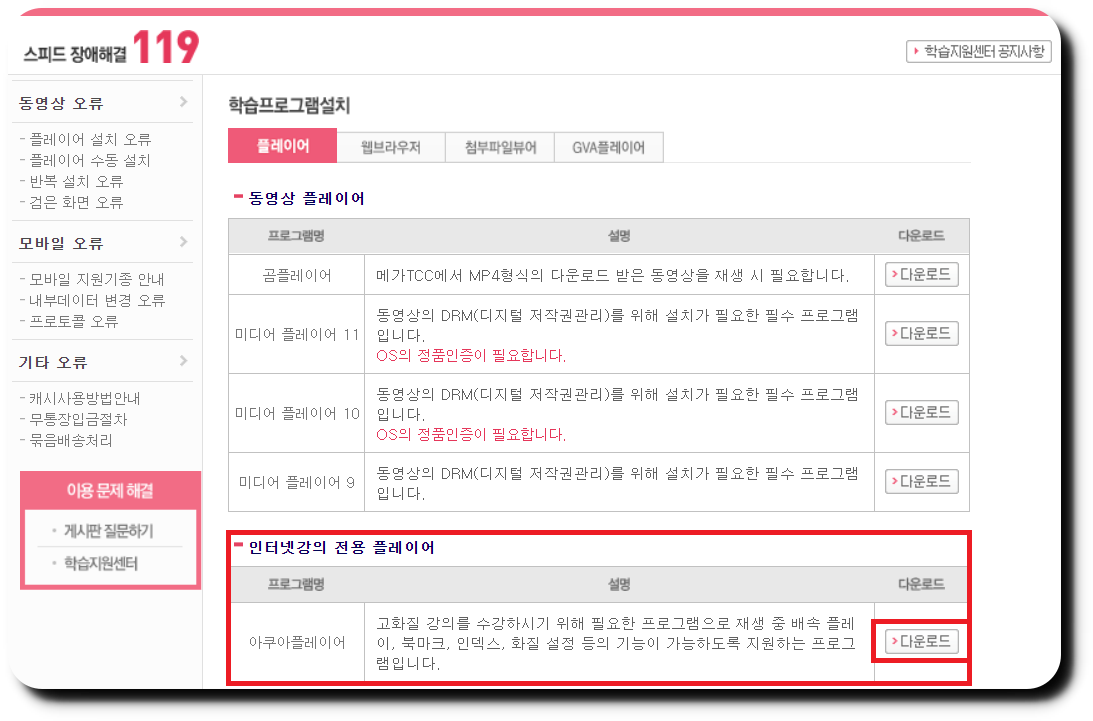 메가스터디 다운로드센터에 접속하게 되면 아래의 경로로 다운로드를 진행해주시면 됩니다. 인터넷강의 전용 플레이어 아쿠아플레이어를 받아주시면됩니다. 아쿠아앤플레이어 인데, 아쿠아플레이어로 나와있네요.