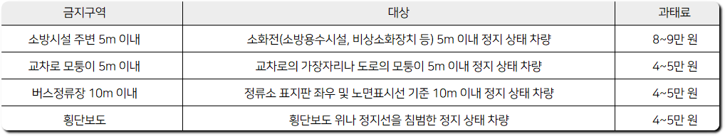 과태료는 아래 표에 나온대로 4만원에서 최대 9만원까지 위반시 부과가 되는데요. 소화전,교차로,버스정류장 그리고 횡단보도 위는 상식적으로도 주차나 정차를 절대하면 안되겠습니다.