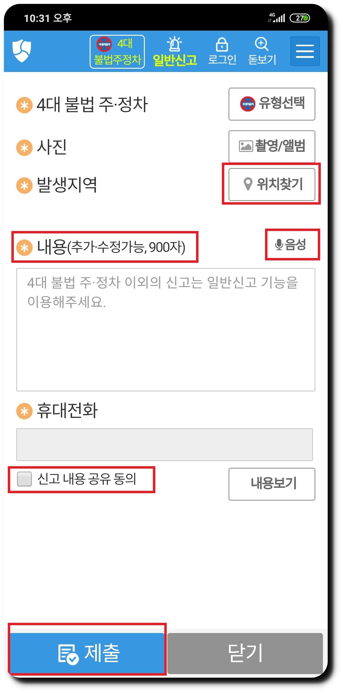 ▼ 차례 대로 위치찾기와 내용을 기재 후, 동의 하여 제출 하시면 끝이 납니다! 내용을 음성으로도 추가 할 수 있다니 좋은 기능이네요.