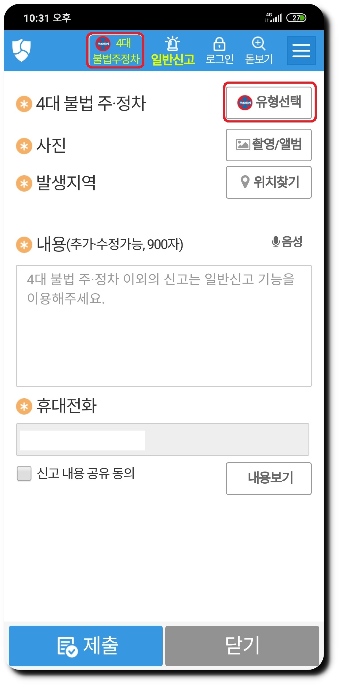 4대 불법 주정차 신고를 하기 위해서는 먼저 '유형선택'을 해줍니다.