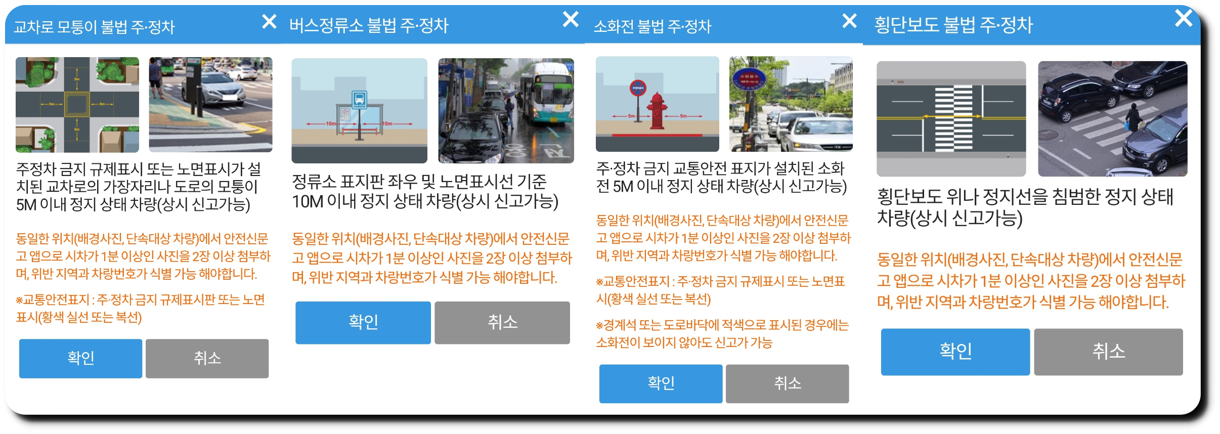 교차로 모퉁이 불법 주정차 : 주정차 금지 규제표시 또는 노면표시가 설치된 교차로의 가장자리나 도로의 모퉁이 5M 이내 정지상태 차량(상시 신고가능)