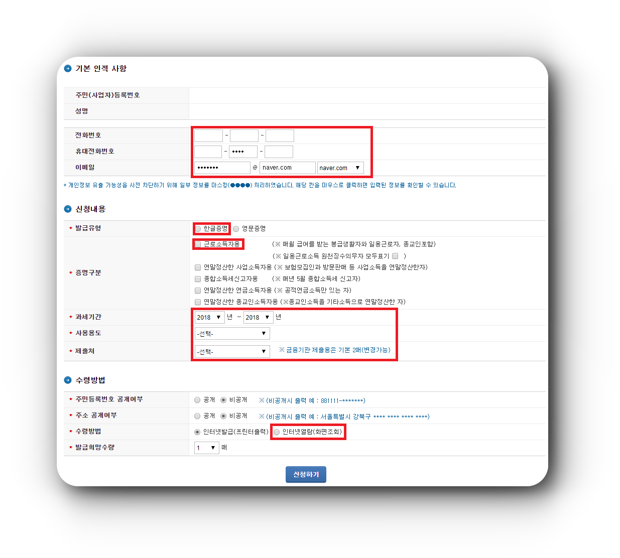 ▼ 로그인을 해주면 바로 신청내용을 입력하는 페이지가 나옵니다. 기본인적사항을 적어주신 뒤, 한글증명 그리고 근로소득자용을 누르고 과세기간은 본인이 일했던 년도 까지 입력해줍니다.