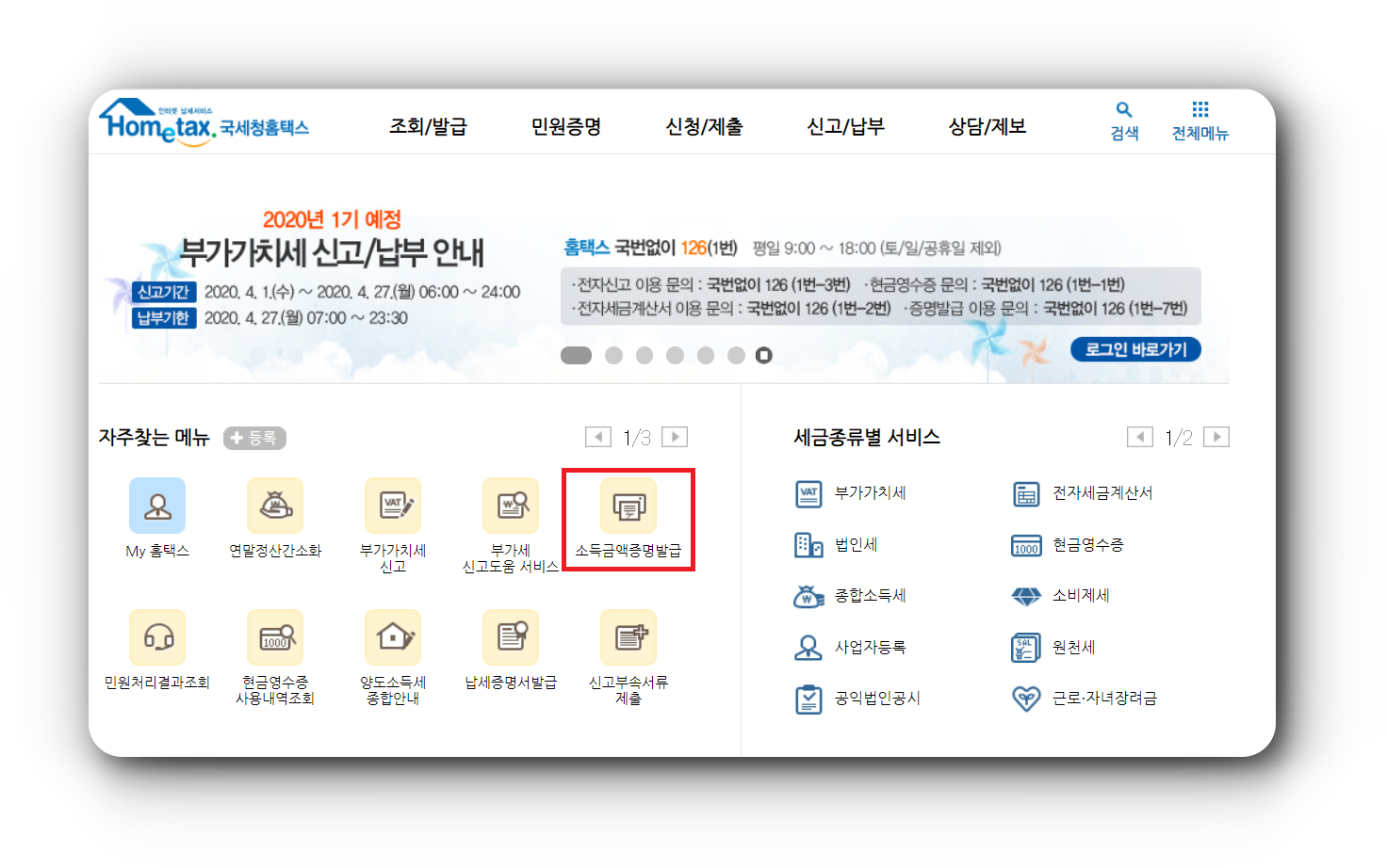 ▼ 국세청의 홈택스(www.hometax.go.kr)로 들어가게 되면 아래와같은 화면이 나오는데, 아래처럼 소득금액증명 발급을 눌러 줍니다.