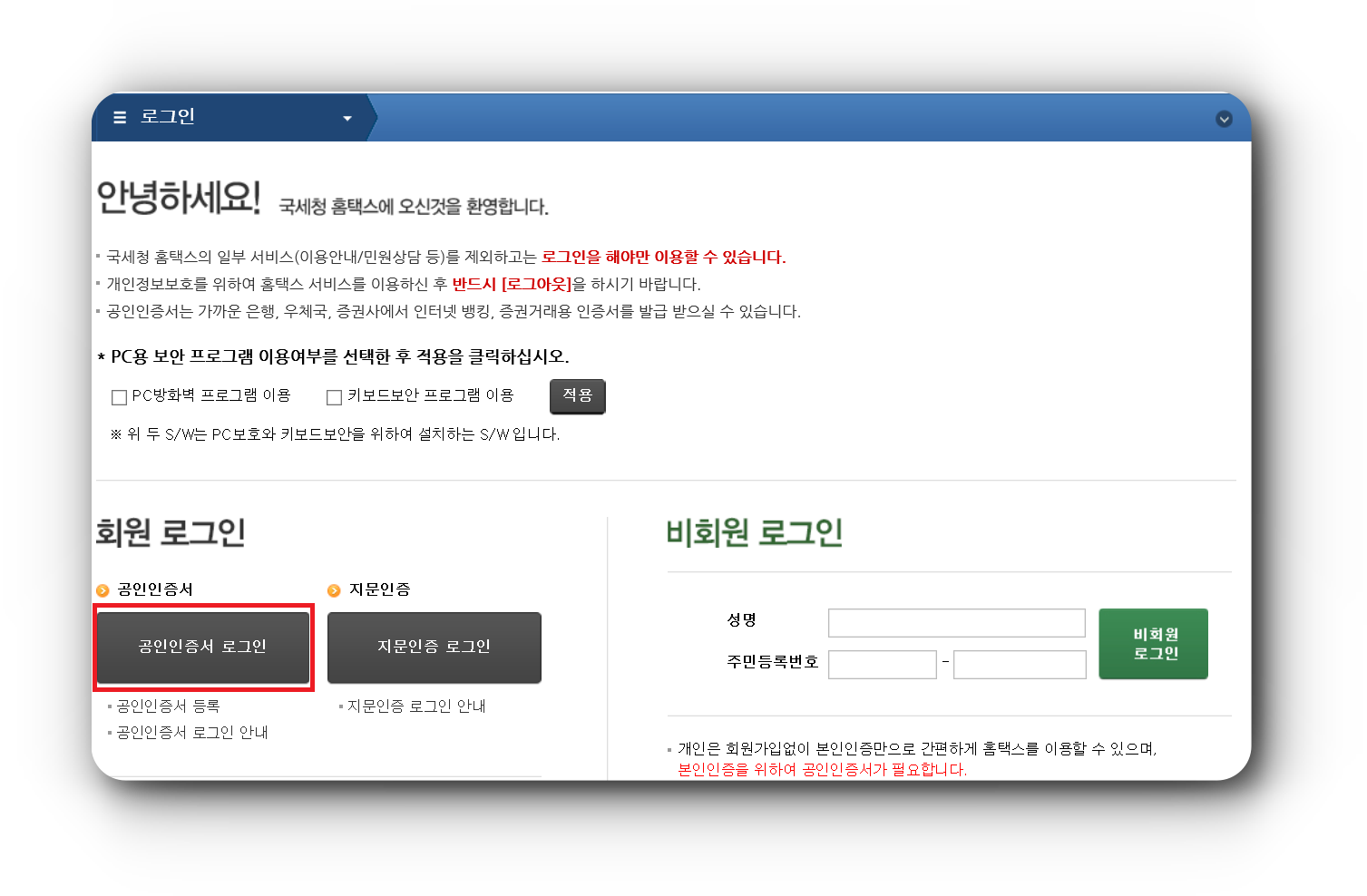▼ 이런, 귀찮은게 나왔네요. 로그인을 해주셔야됩니다. 공인인증서로 로그인을 해줍니다!