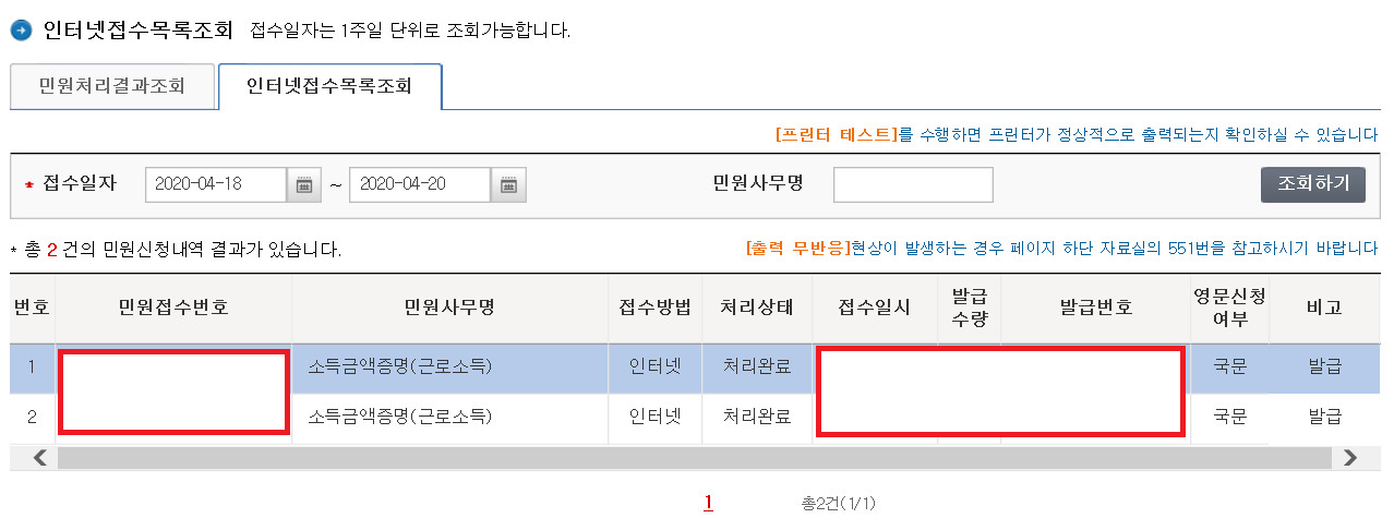 저는 2008년부터 일을 해서 2008년 부터로 설정했고, 나머지 용도나 제출처는 기타로 했습니다. 또한 수령방법은 출력을 할 필요가 없어서 단순 열람으로 설정하였습니다.