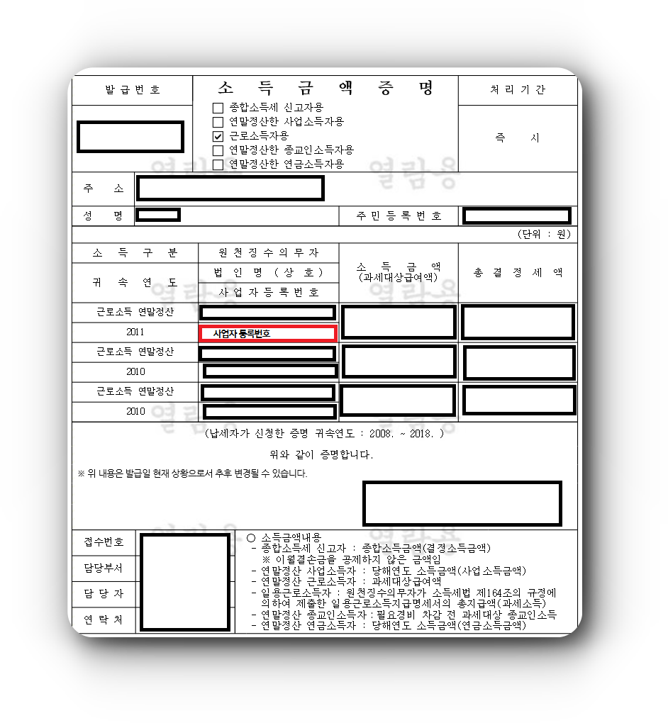 생각해보면 방법은 간단합니다. 국세청의 홈택스(www.hometax.go.kr)에서 '소득금액증명'을 발급받거나 열람을 하면 내가 지금까지 일했던 모든 직장에서의 사업자등록번호를 조회할 수가 있습니다.