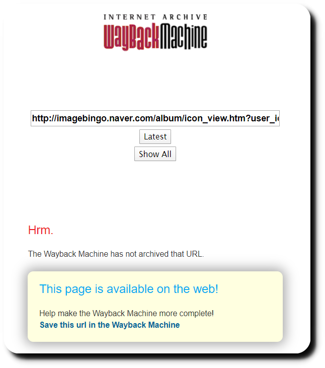 아래 이미지처럼 Wayback 기계가 해당 URL을 가지고 있지 않다고 나옵니다.