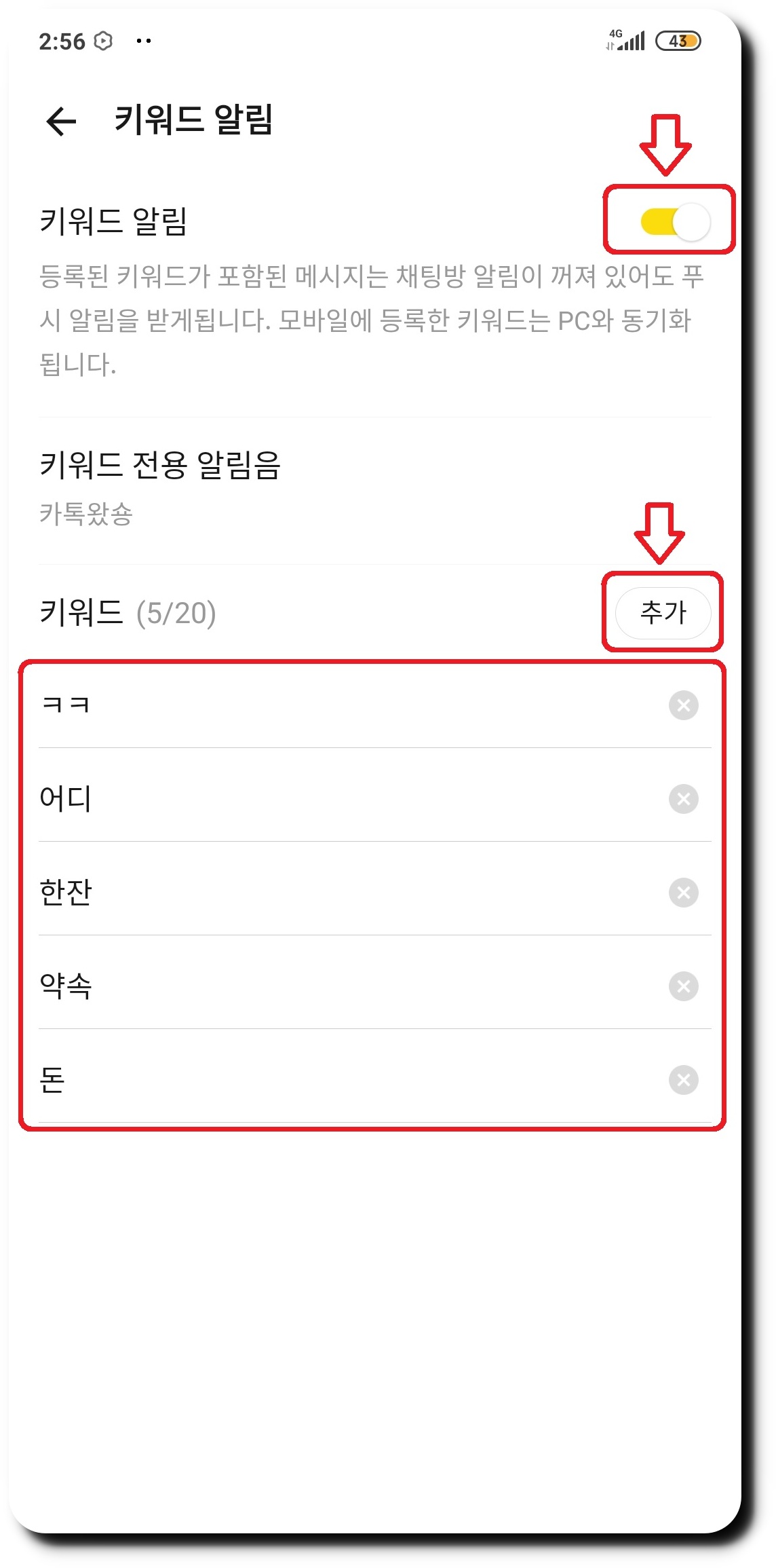 이 키워드 알림 기능은 등록된 키워드가 포함이 된 메시지라면, 채팅방에서 알람을 꺼놓았다고 해도 푸시알림을 받을 수가 있게 되는 기능이고 핸드폰에서 키워드를 등록했다면 PC 카톡에서도 동기화가 되어 플랫폼 마다 등록할 필요는 없다고 합니다.