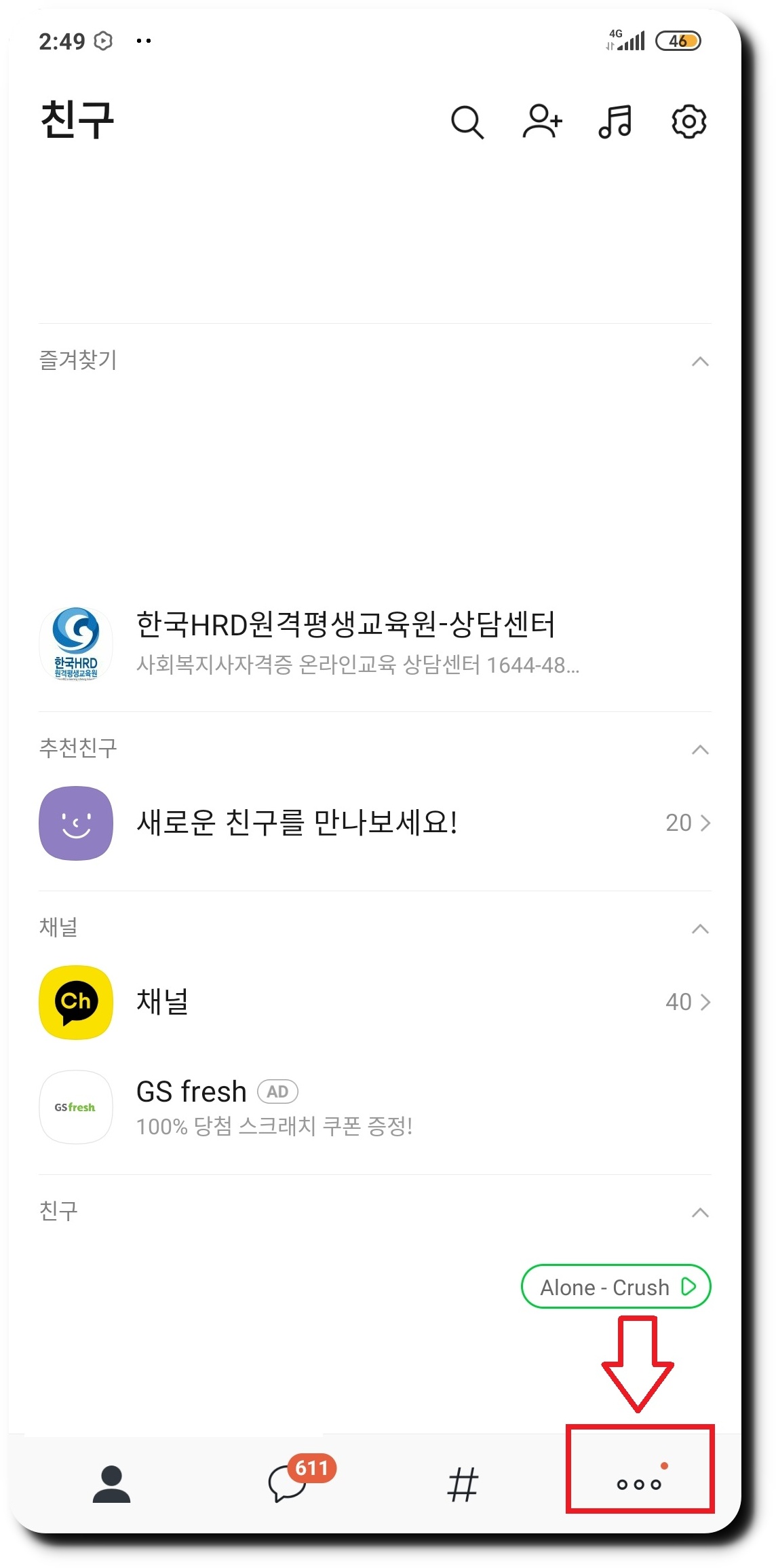 🔻일단 카톡을 실행 시킨 후, 오른쪽 제일 하단에 '점점점' 기타 메뉴 표시로 진입해 줍니다.