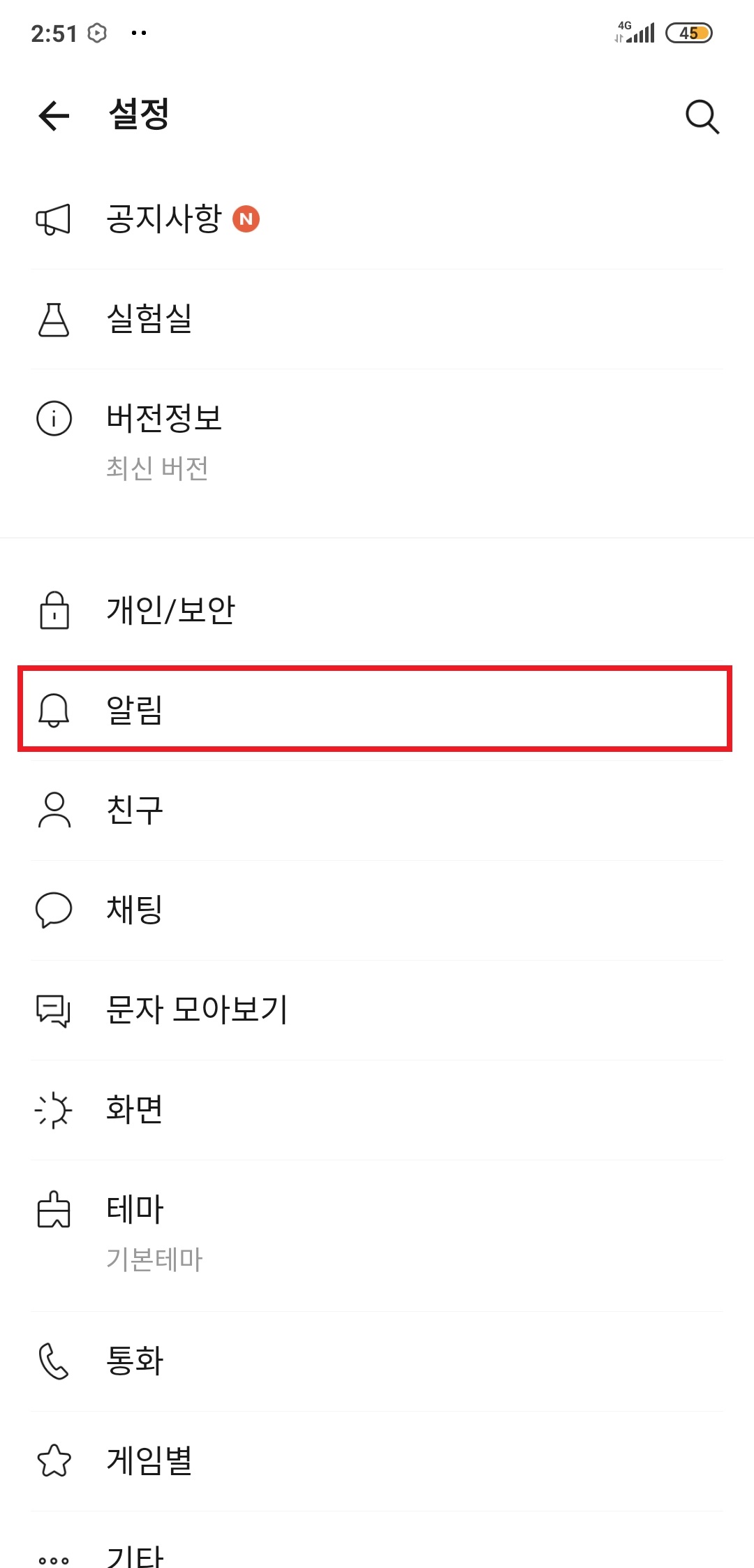 🔻 설정으로 진입을 하셨다면 개인/보안 아래에 있는 옵션인 '알림'을 눌러줍니다.