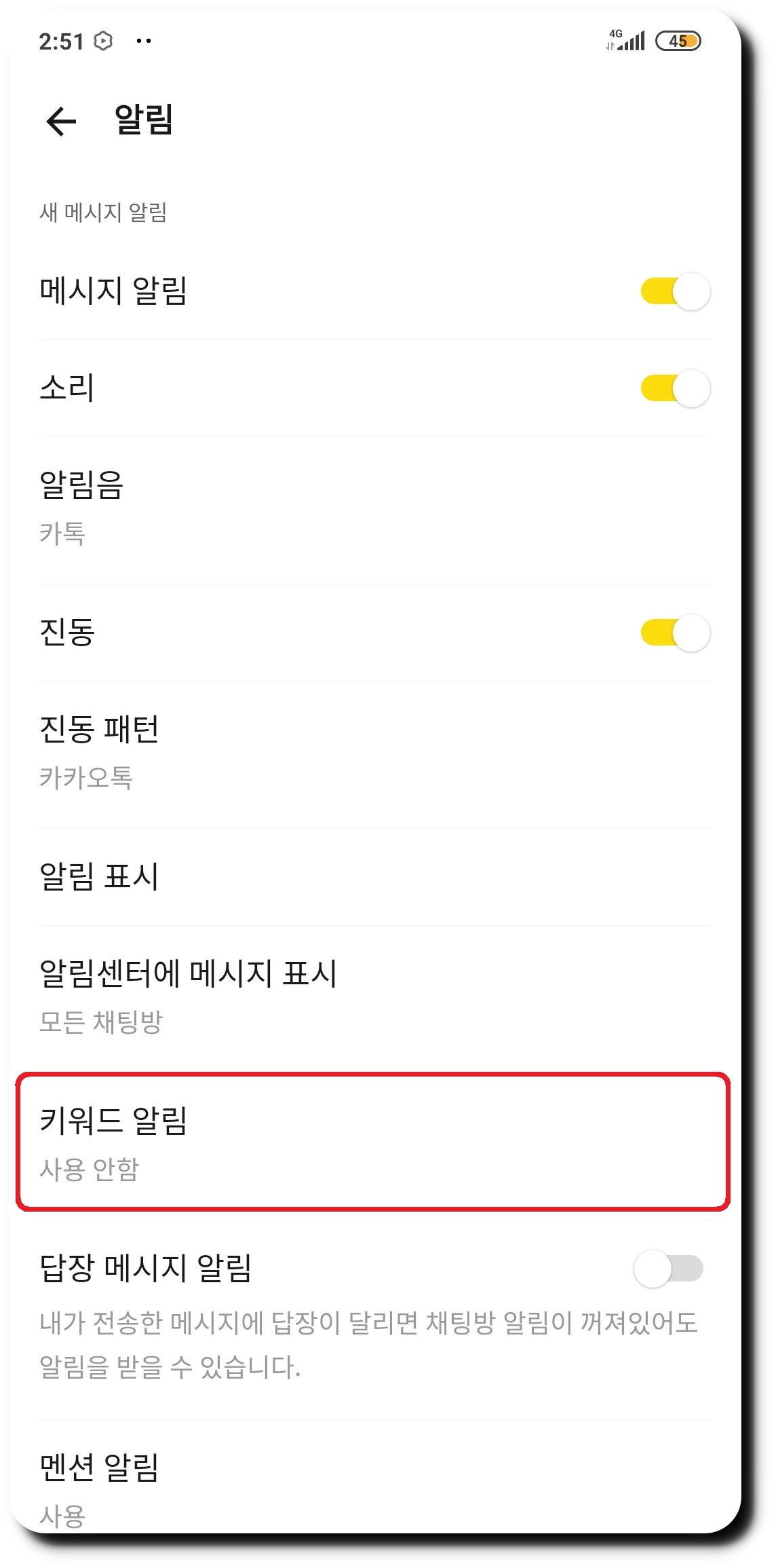 모든 사람에게 한 번 씩 카톡이 오지는 않겠지만 단톡방이나 활발할 채팅방은 알람을 꺼놓기 마련이죠! 알람이 뜨면 일일이 확인할 수가 없으니 내가 원하는 키워드가 나오면 알람이 울리게 해봅시다.