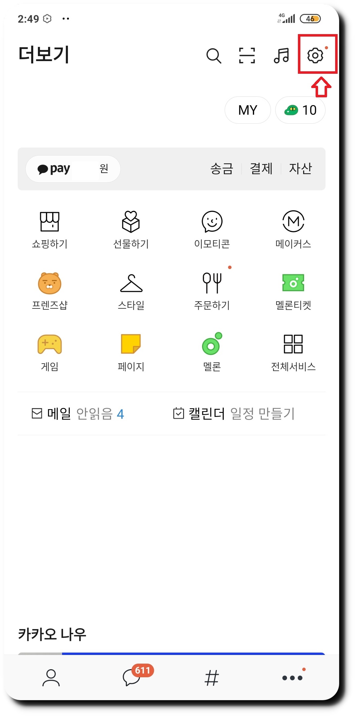 기타메뉴에 들어오셨다면, 이번에는 제일 오른쪽 상단의 톱니 바퀴모양인 설정으로 진입을 해줍니다.