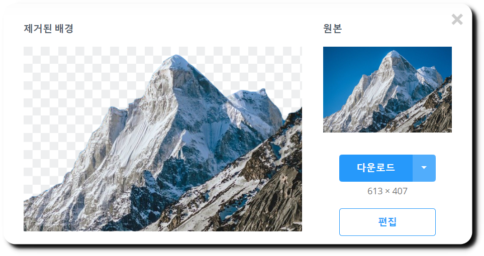 업로드 중이라고 나오는 것을 잠시만 기다려주면 됩니다. 약 3초 뒤, 산 위에 하늘 배경들이 모두 누끼가 따진 것을 확인할 수가 있습니다. 굉장히 간편합니다.