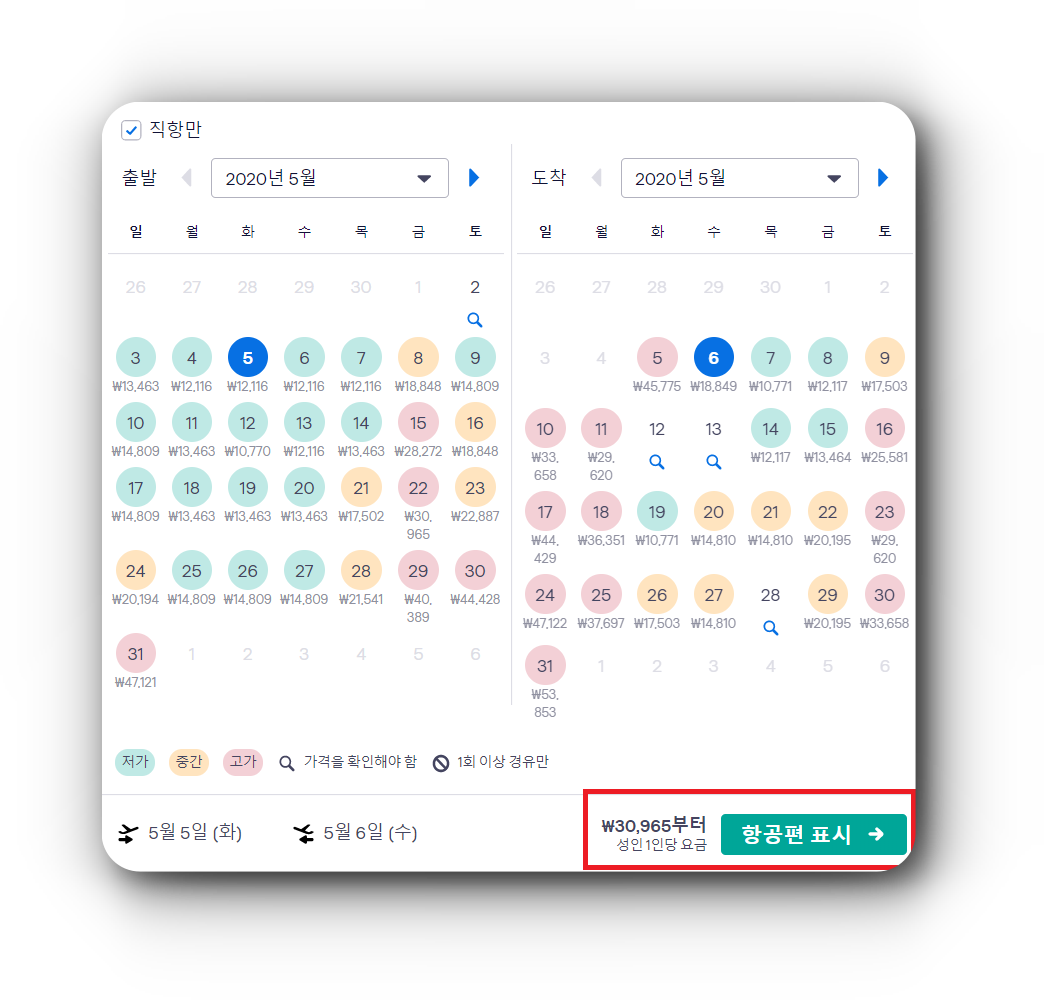 🔻 검색을 하게 되면 아래처럼 달력이 나오게 되는데 달력마다 최저가가 나옵니다. 여기서 저는 '직항만'을 추가 옵션으로 설정 한 뒤에 5월 5일 출발 그리고 5월 6일 돌아오는 왕복 항공권을 눌렀습니다. ₩30,965원 이네요.