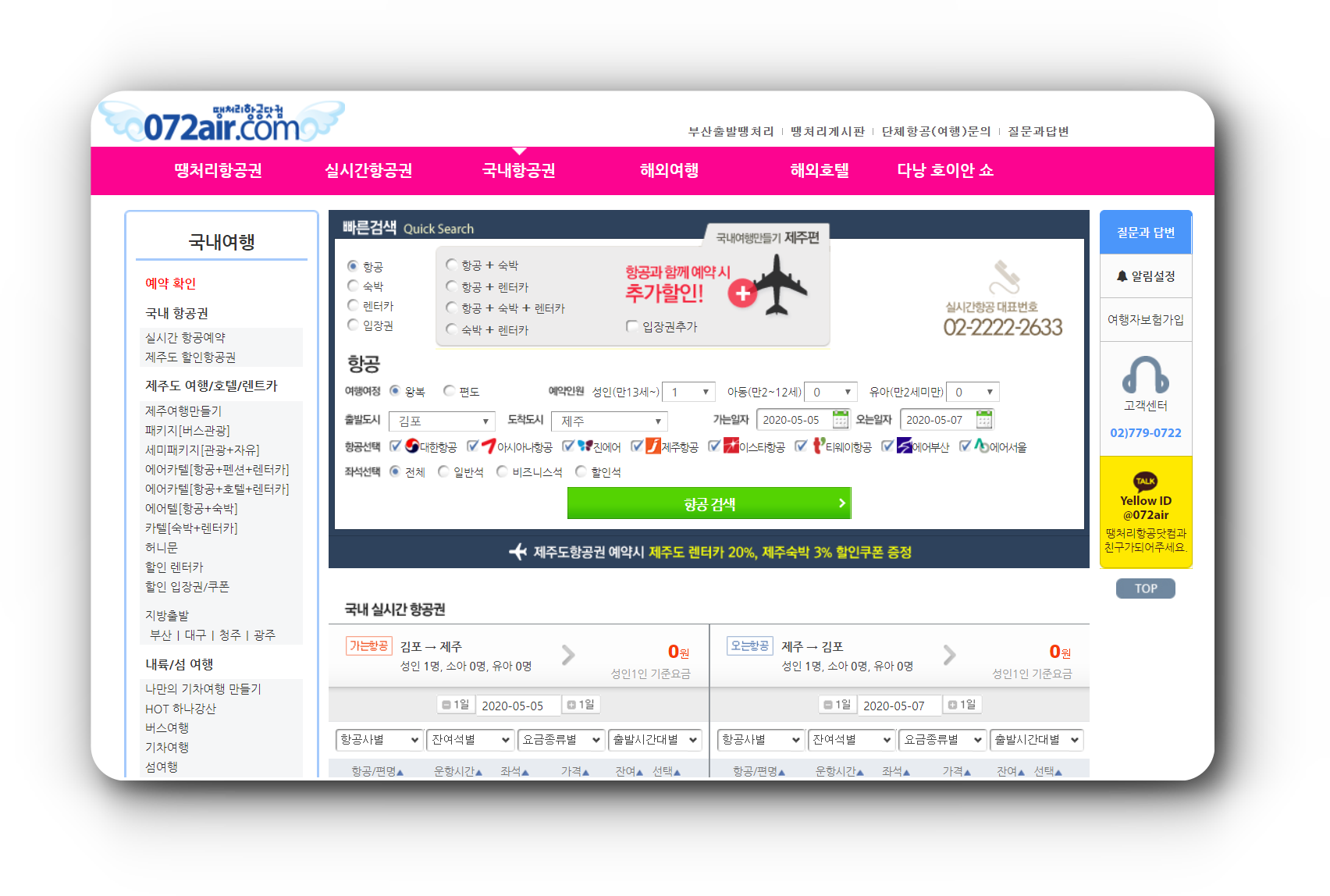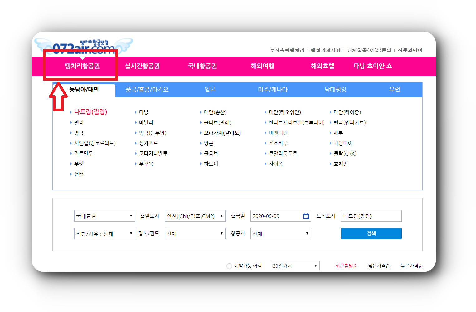 개인적으로 두 세번 밖에 이용해보지 않았지만, 상당히 괜찮은 항공권 구매 예약 방법입니다. 바로 땡처리항공권 홈페이지 에서 제공하는 말그대로 땡처리하는 항공권을 싸게 예약하는 방법입니다. http://072air.com/ 에 접속하게 되면,