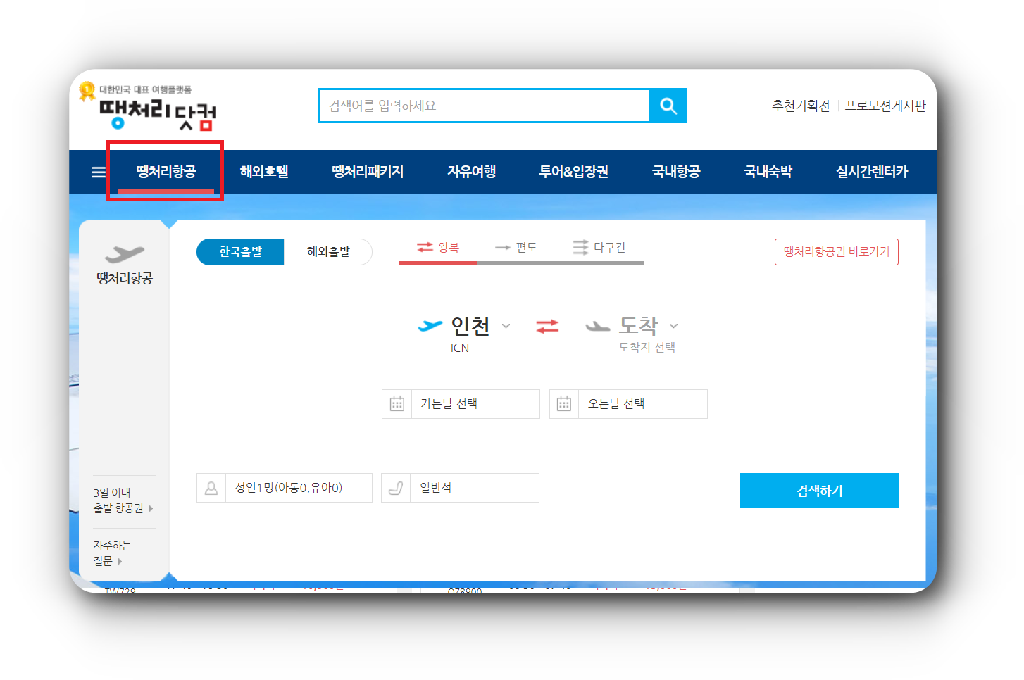 🔻 땡처리닷컴 역시 유명하죠. http://www.ttang.com/index.do에 접속하면 마찬가지로 검색창이 뜨는데 바로 검색해 보겠습니다.