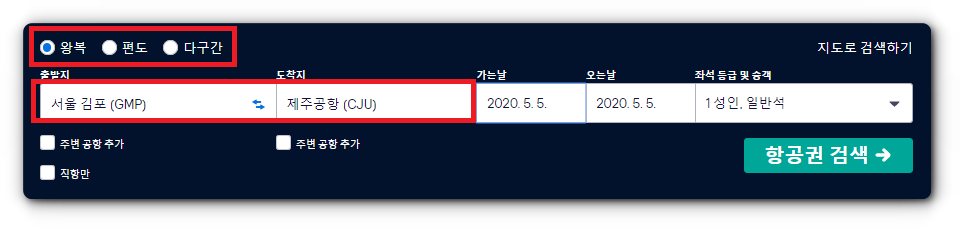 🔻 일단 왕복/편도/다구간을 먼저 선택해 주시고, 출발지와 도착지를 설정해 줍니다.