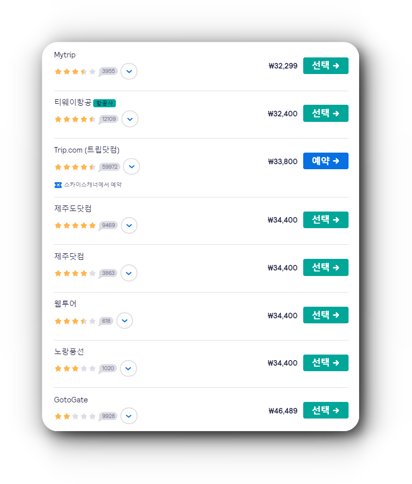 🔻 항공권을 예약할 수있는 서비스를 제공하는 업체 목록을 보여 주게 됩니다. Mytrip 부터 시작해서 트립닷컴, 제주도닷컴, 제주닷컴, 웹투어, 노랑풍선 등등 수 많은 예약 업체 목록이 보여지게됩니다.