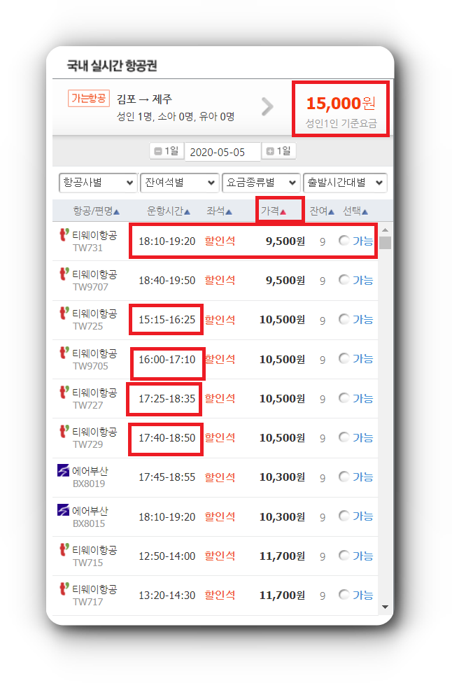 🔻 국내 실시간 항공권으로 접속하게 되면, 특정날짜를 검색한 뒤 아래처럼, 잔여 항공권과 시간 그리고 가격을 확인 할 수가 있습니다.