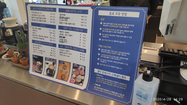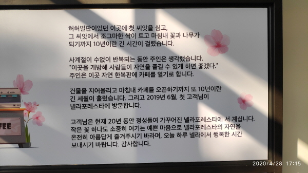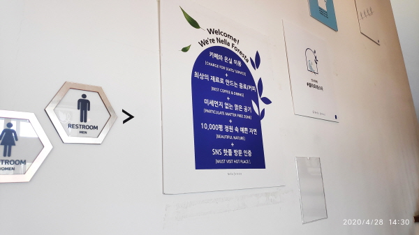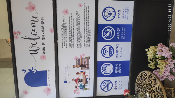 먹을거리/마실거리를 주문하기 위해서 건물로 들어서면 여러가지 안내 게시글들을 확인할 수가 있습니다. 환영합니다. 넬라포레스타 입니다.