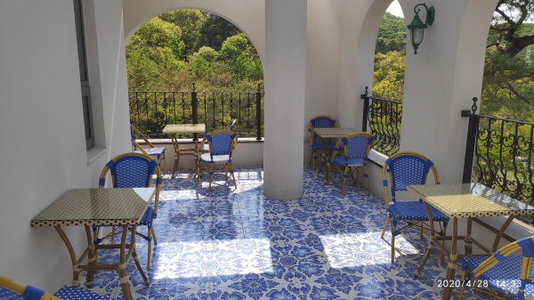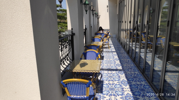옆을 보면 2층 테라스로 나갈 수 있는 문이 보입니다. 나가보니 시원한 파란색 풍으로 인테리어가 된 공간이 나옵니다. 사람이 별로 없네요. 아주 좋습니다.