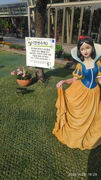 올라갈 때 천천히 올라가면 물레방아도 보이고, 골프카트가 지나가는 것도 보입니다. 천천히 보아야만 볼 수있는 것들이죠. 사람들도 꽃들 앞에서 사진을 찍고 있네요.