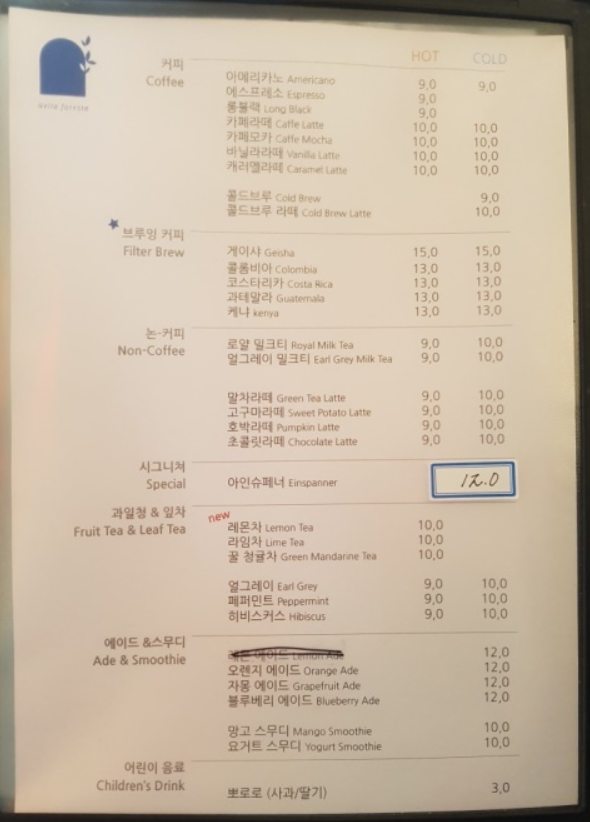 위 메뉴판은 직접 찍은 사진이고 아래 메뉴판은 넬라포레스타에서 제공되는 이미지입니다. 저는 딱히 메뉴판을 보고 주문을 하지 않아서 메뉴판을 못봤네요...