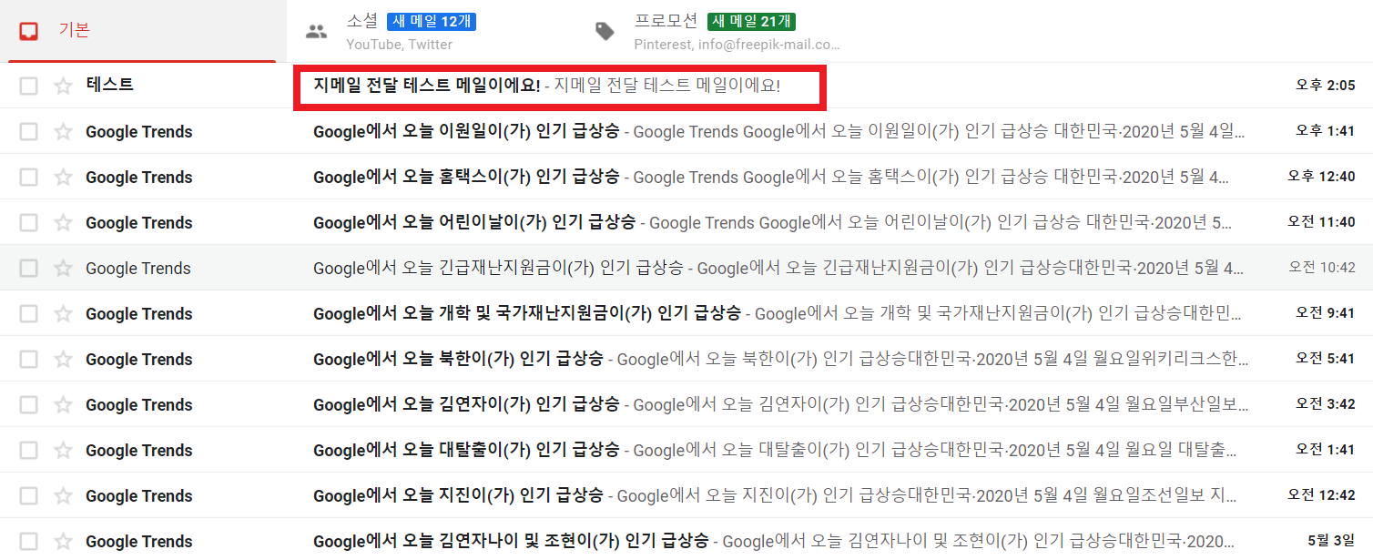 🔻 제 3의 메일로 제 구글 지메일로 테스트 메일을 보내 보았습니다. 이메일이 잘 도착했네요. 그렇다면 제가 연결한 네이버 메일에도 이메일이 왔는지 확인해 보겠습니다.