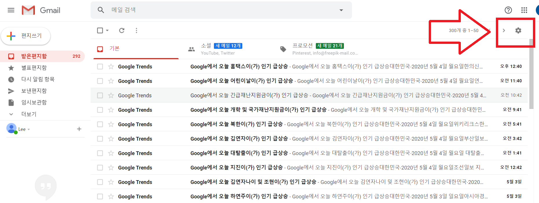 🔻 Gmail 로 들어오셨다면 우측 상단에 톱니바퀴 모양의 설정을 눌러서 진입을 해주겠습니다. 메일 내용이 구글 트랜드에서 구독한 내용들의 이메일로 꽉 차 있습니다. 빨리 제가 주로 사용하는 네이버 메일로 자동으로 메일이 오게 하고싶네요.
