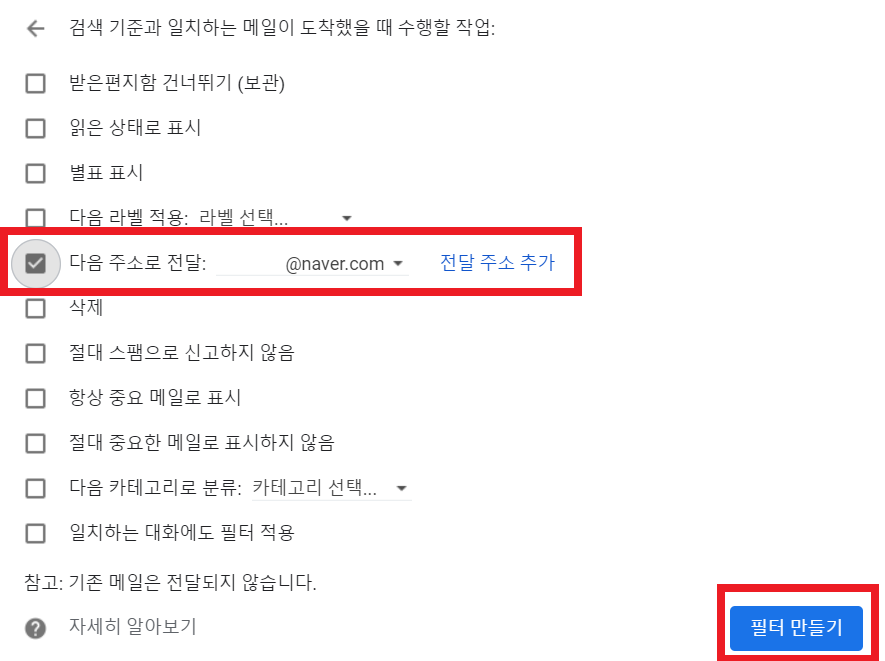 🔻 주소를 입력 해준 뒤, '검색 기준과 일치하는 메일이 도착했을 때 수행할 작업'에서 다음주소로 전달의 체크박스에 체크를 해주고 기존에 입력했던 주소를 '전달 주소 추가'버튼을 눌러 추가 한 뒤, 필터 만들기를 눌러줍니다.