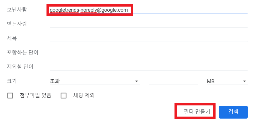 🔻 보낸 사람에 구글트랜드에서 온 이메일 주소를 찾아서 입력을 해줍니다. 그리고 필터만들기를 차례로 눌러줍니다.
