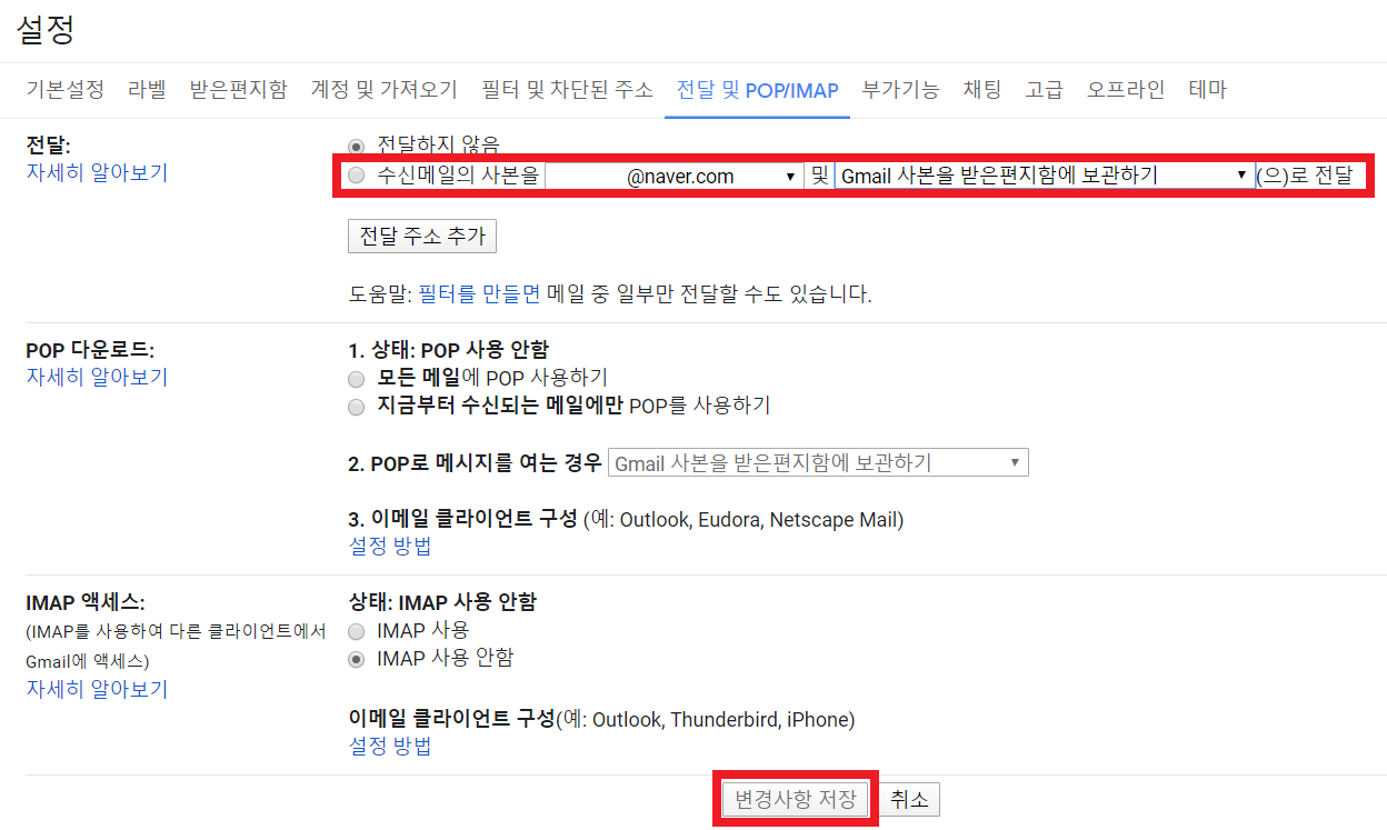 🔻 이제 다시 지메일로 돌아와서 '새로고침'을 눌러주면 아까 없었던 옵션이 생겼습니다. 이제 아래 '수신메일의 사본을 xxx@naver.com 및 Gmail 사본을 받은 편지함에 보관하기로 전달을 체크하고 아래에서 변경사항 저장을 눌러줍니다.