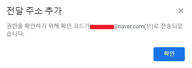 🔻 추가를 눌러주게 되면, 확인 창이 하나가 뜨는데, 확인을 눌러주게 되면 인증메일이 제가 입력한 메일로 날아가게 되는데요. 이제 네이버로 로그인해서 인증메일에서 승인 링크를 눌러주시면 됩니다.